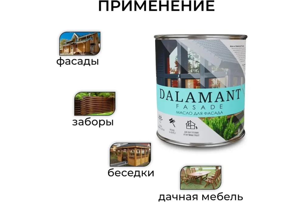 Dalamant Fasade - высококачественное натуральное масло предназначено для финишного покрытия фасадных вертикальных конструкций из любой породы дерева: фасады, заборы, беседки и др. Масло подчеркивает природную красоту дерева, выделяя его структуру. Не образует на поверхности пленку, что позволяет сохранить естественную вентиляцию древесины. Состав глубоко проникает в структуру древесины, защищая ее изнутри. Благодаря натуральному воску, входящему в состав масла, покрытие становится полностью гидрофобным, эффективно защищает древесину от растрескивания, влаги, грибка, синевы, плесени, насекомых, УФ-лучей и атмосферных нагрузок. Продлевает срок службы древесины, с возможностью локальной реставрации. Образует матовое покрытие. Рекомендовано для наружных работ.