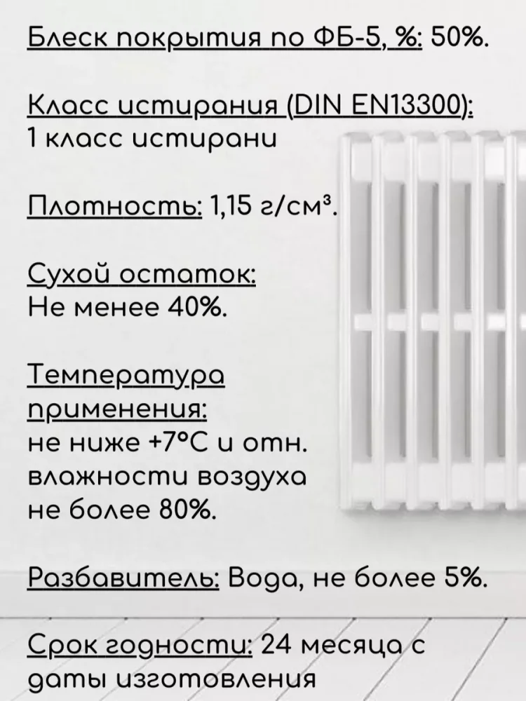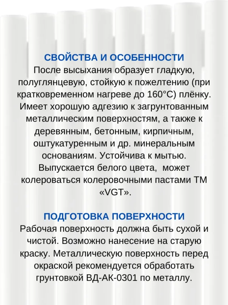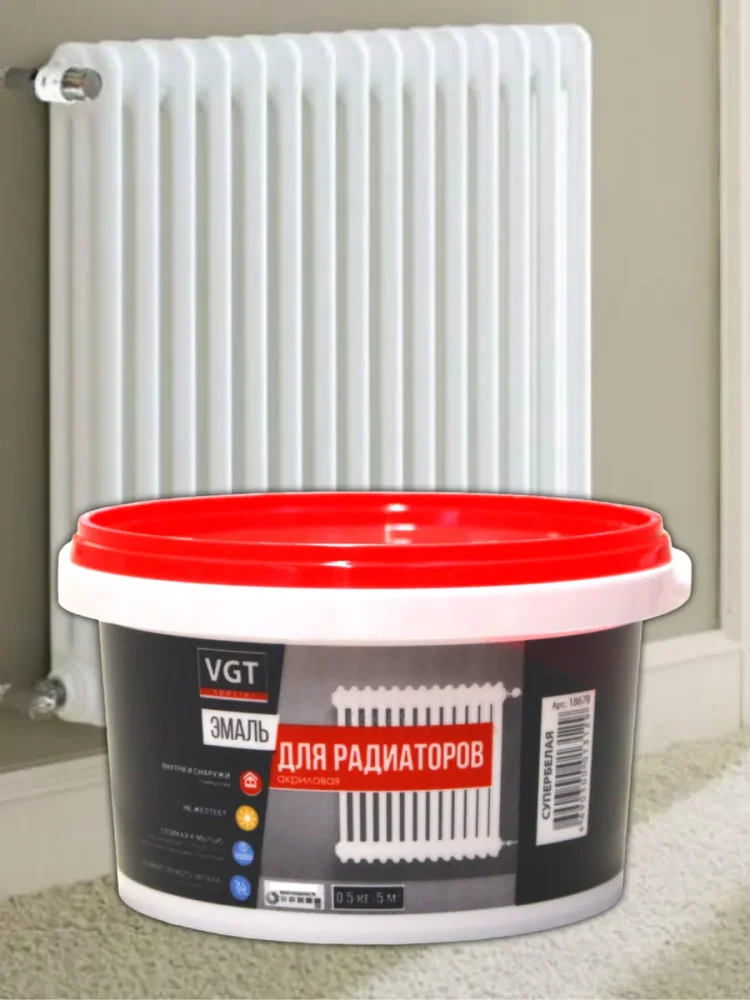 Эмаль VGT Профи для радиаторов, супербелая, предназначена для финишного окрашивания радиаторов, труб водяного отопления и водоснабжения в бытовых и строительных условиях. Изготовлена на основе самосшивающейся акриловой дисперсии, обеспечивающей более качественные характеристики по сравнению с другими обычными полимерами. После высыхания образует гладкую, глянцевую пленку, стойкую к пожелтению (при кратковременном нагреве до 160 градусов).