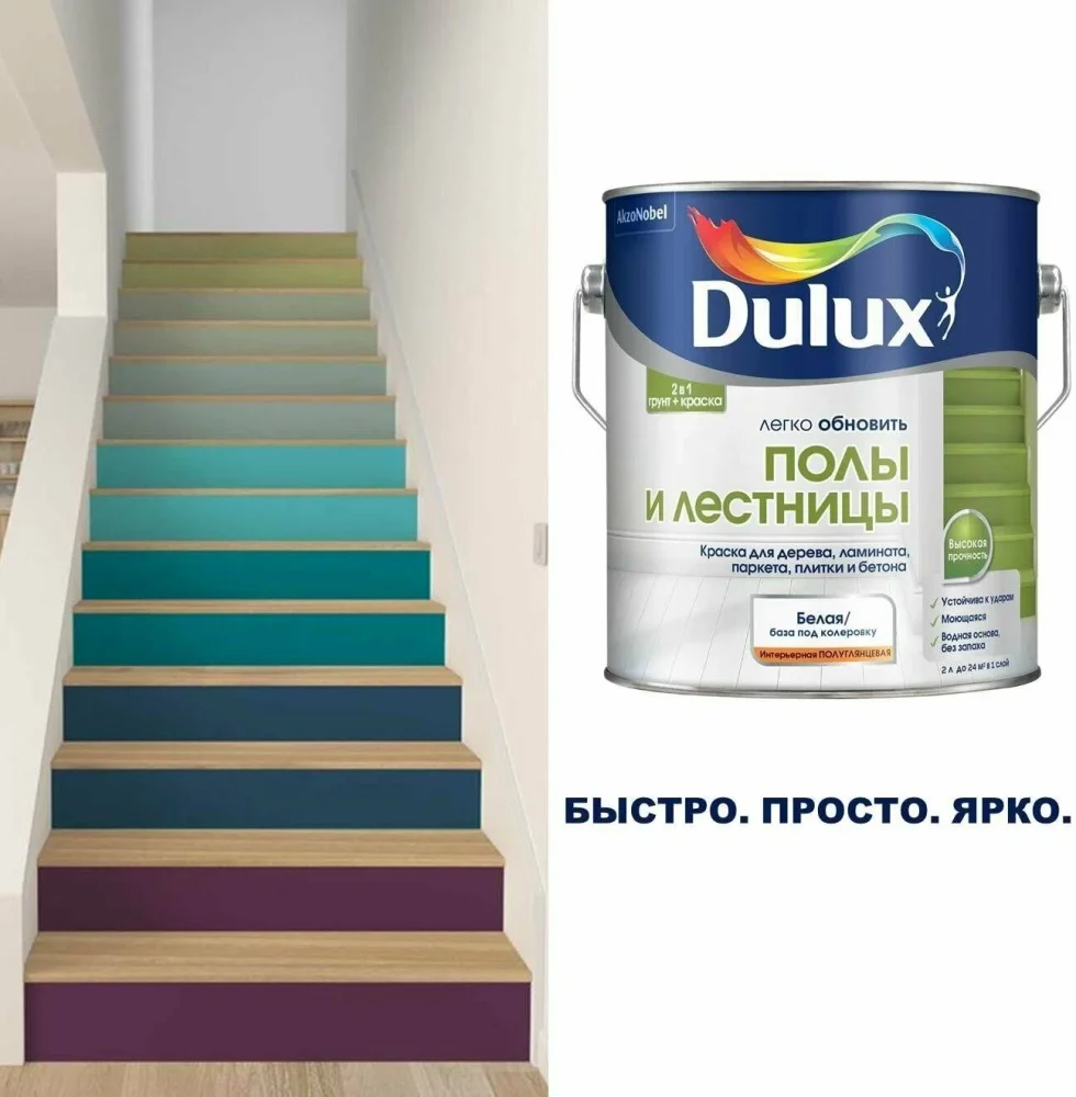 Dulux Полы и лестницы – высококачественная полуглянцевая краска на водной основе для пола. Сверхпрочное износостойкое покрытие устойчиво к ударам, загрязнениям и мытью. Без труда превращает старый пол в новый. Не требует грунта на новых и ранее окрашенных материалах. Краска легко наносится, отлично разравнивается, образуя ровную поверхность.