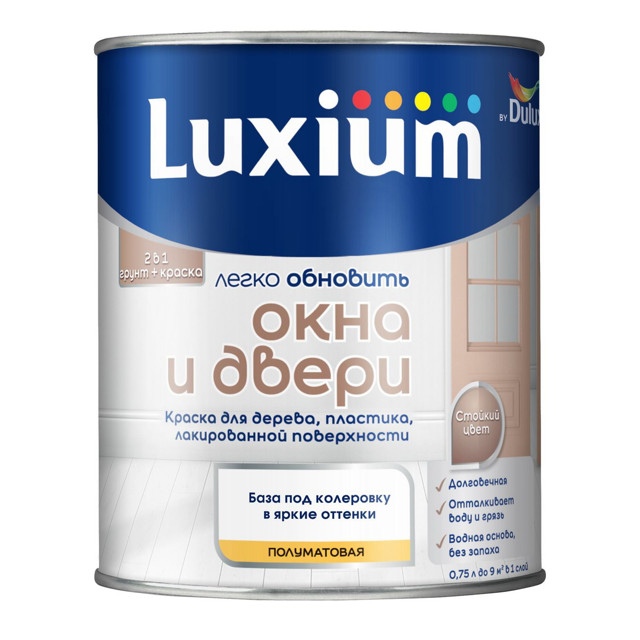 Краска для дерева и пластика Dulux Окна и двери полуматовая. Прочное и долговечное покрытие устойчиво к УФ-излучению, не меняет цвет со временем, выдерживает перепады влажности и температуры внутри и снаружи помещения. Окрашенные поверхности не слипаются после высыхания. Не требует грунта на новых и ранее окрашенных материалах.