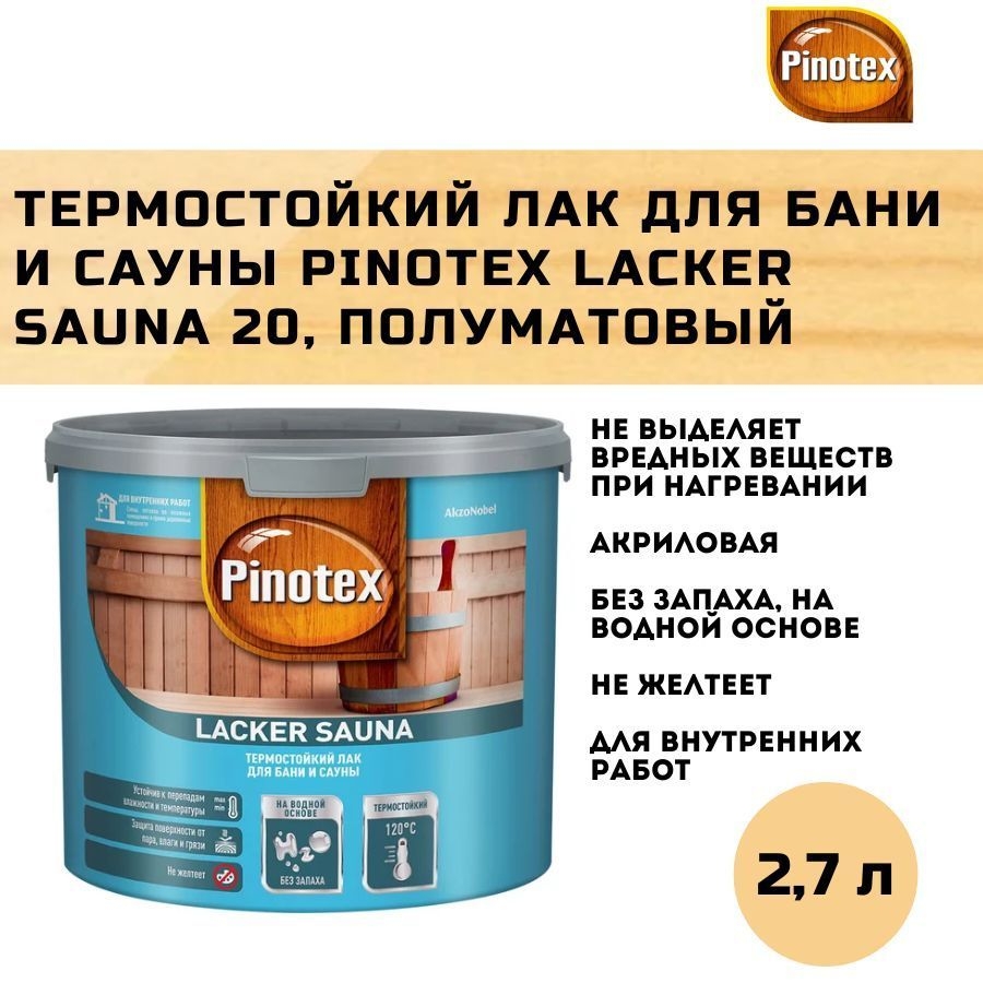 Лак для бань и саун Pinotex Lacker Sauna — полуматовый состав на водной основе для деревянных стен и потолков, подверженных постоянному воздействию высоких температур и повышенной влажности. Выдерживает до 120°С, не выделяет вредных веществ при нагревании, не желтеет. Образует прозрачное покрытие с высокой эластичностью, защищающее деревянные поверхности от влаги и пара, грязи. Подчеркивает естественную структуру древесины. Быстро сохнет.