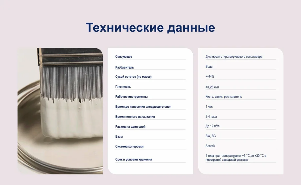 Хранение и срок годности: 4 года при t° от +5°С до +30°С в невскрытой заводской упаковке вдали от источников излучения, нагревательных и осветительных приборов; плотность ≈1,25 кг/л; 2 класс устойчивости к мокрому трению.